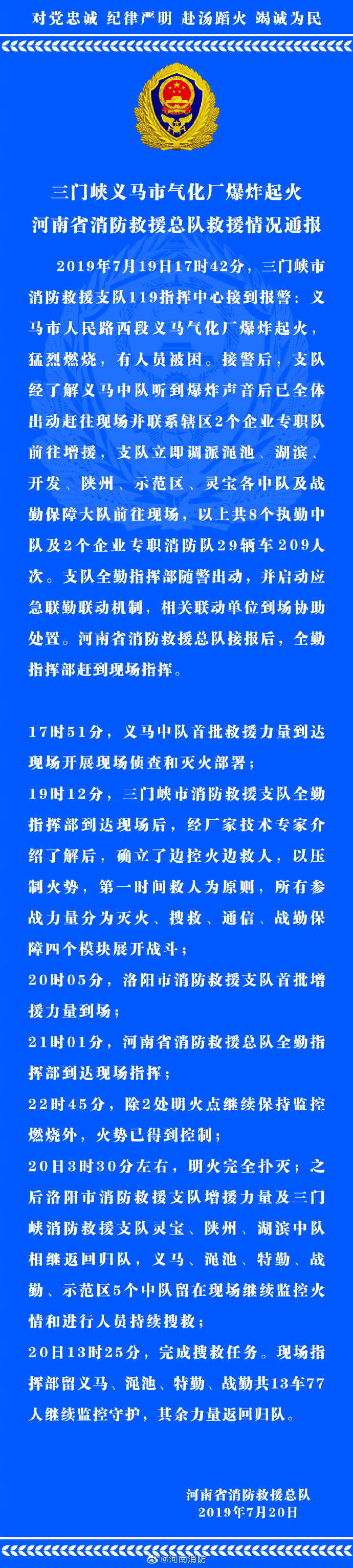 新京报快讯 河南省消防救援总队20日通过官方微博通报三门峡义马市气化厂爆炸救援情况。