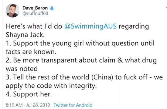一些澳大利亚的民族主义“键盘侠”更是要求澳大利亚泳协继续支持莎娜·杰克,并让包括中国在内的全世界都对这件事情“滚远点”。