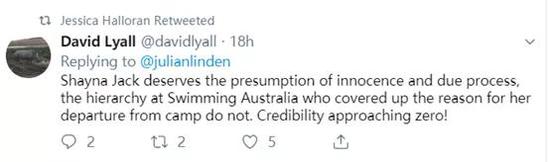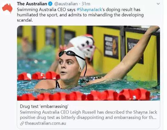 澳大利亚体育反兴奋剂机构(ASADA)的一名前负责人也在个人的账号上进一步抨击了澳大利亚泳协,质问澳大利亚泳协为何要在6月26日就已经知道莎娜·杰克药检不过关的情况下,仍让她对外宣称自己只是“因为个人原因却缺席比赛”。