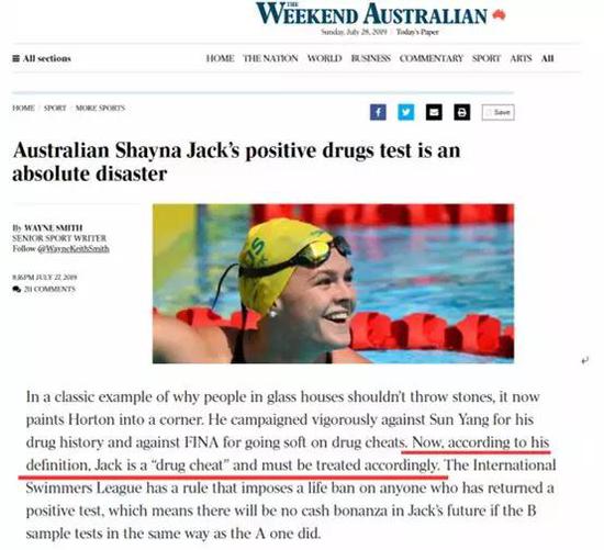 澳大利亚的主流大报《澳大利亚人报》也是直接在标题中感叹说:莎娜·杰克被药检阳性是一个纯粹的灾难。该报也同样表示此事已经把霍顿逼到了一个角落里,因为按照他此前对孙杨是“嗑药作弊者”的严格定义,那他的队友莎娜·杰克也是一个“嗑药作弊者”了。