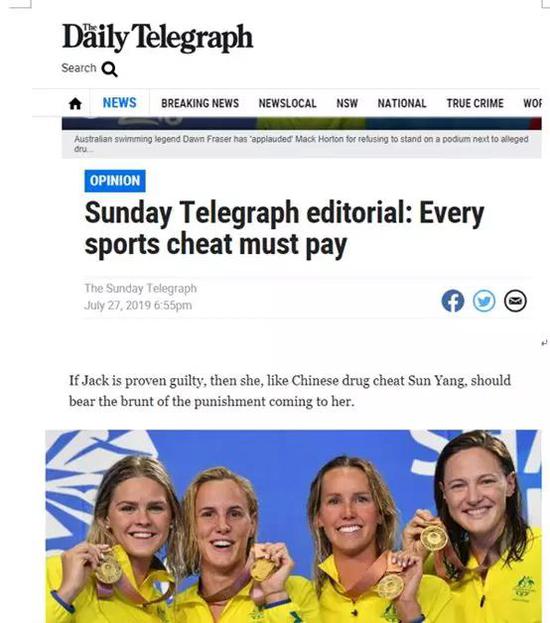 该媒体称,其实澳大利亚泳协早在6月26日就知道澳大利亚金牌选手莎娜·杰克药检没过关的事情,却对包括自己队员在内的全世界进行隐瞒,害得在韩国光州的世锦赛上对中国的孙杨发难的霍顿以及整个澳大利亚泳协,都成为了全世界的笑柄。