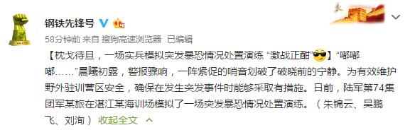 据中国人民解放军陆军第74集团军官方微博“钢铁先锋号”报道,日前,陆军第74集团军某旅在湛江某海训场模拟了一场突发暴恐情况处置演练。