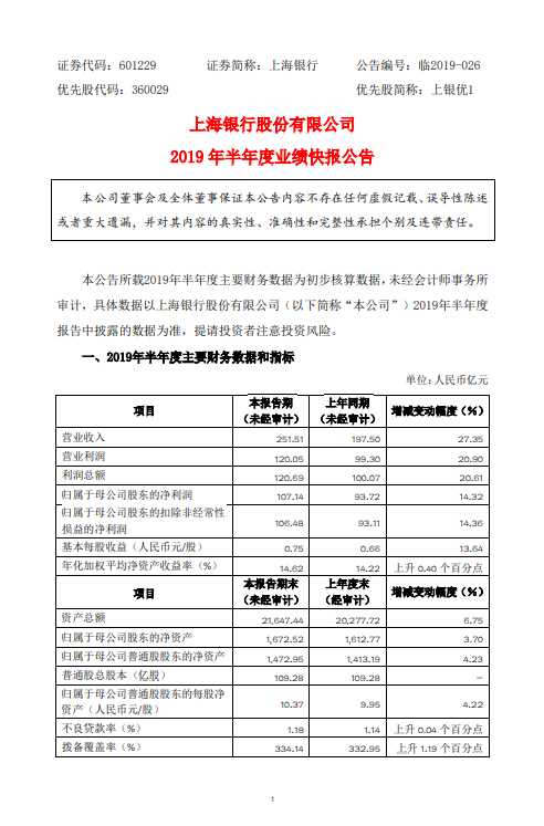 新浪财经讯 7月24日消息,上海银行公布业绩快报,上半年该行实现营业收入251.51亿元,同比增长27.35%;归属于母公司股东的净利润107.14亿元,同比增长14.32%;基本每股收益0.75元,同比增长13.64%;年化加权平均净资产收益率14.62%,同比提高0.40个百分点;报告期末归属于母公司普通股股东的每股净资产10.37元,较上年末增长4.22%。