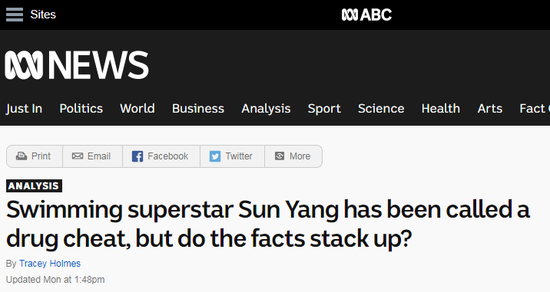 ABC指出,很多媒体拿“兴奋剂欺骗”来做标题吸引眼球,还声称孙杨面临的是“终身禁赛”。但他们没有说的是,他也可能被证无罪。