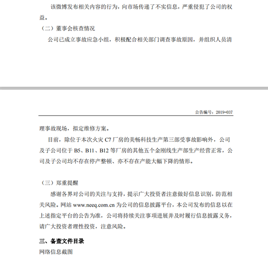 目前,除位于本次火灾C7厂房的美畅科技生产第三部受事故影响外,公司及子公司位于B5、B11、B12等厂房的其他五个金刚线生产部生产经营正常,公司及子公司均不存在停产整顿、亦不存在产能大幅下降的情形。