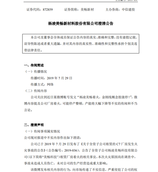 新浪财经讯 7月29日消息,新三板公司美畅新材澄清公告:某微博账号发文“杨凌美畅着火,金刚线概念股涨停!”,微博内容提及公司厂房着火,可能停产整顿,产能将大幅下降,该微博发布相关内容的行为,向市场传递了不实信息,严重侵犯了公司的权益。