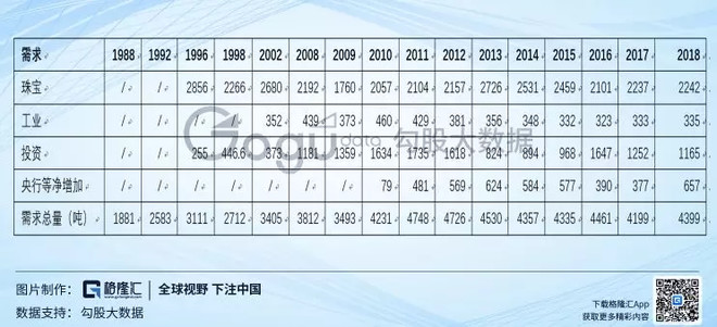 黄金用于工业的比例是非常有限的,过去三十年大部分都是卖给个人。通过看如下表,我们可以看到,黄金过去二十多年的珠宝总需求基本没变,这两年的珠宝需求跟90年代差不多,甚至比90年代的高峰年份还要低,需求主要增长来来自于个人投资和央行投资。