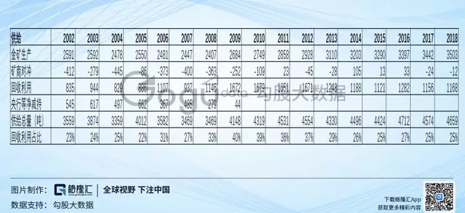 从2002年至今,回收利用占黄金的供给一般占25%以上,个别年份黄金价格达到阶段性高点(2009-2012年)的回收利用量激增,而2013年之后金价回落之后,回收利用量也相应回落。因此回收利用在金价高的时候会形成很大的供给来源,压制金价。