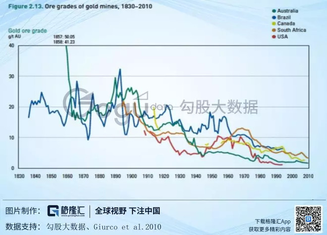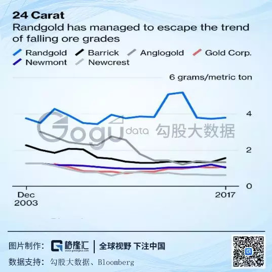 从彭博汇总的主要金矿矿商的品位来看,从2003年到2017年总体上是一个下降的趋势。