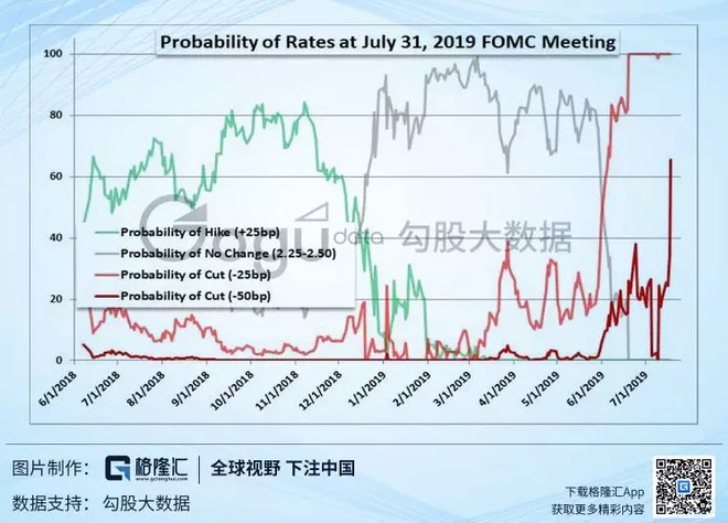 上图中,我们可以看到2019年5月中开始,(从短期利率期货里推断)市场预计美联储7月会议的降息25 个基点的概率从20%上升到100%,降息50个基点的概率从0%上升到60%(截至7月19日已经回落到25%。)