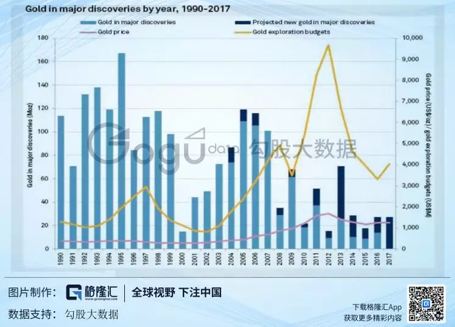 1)即使2011年金价达到1800美元一盎司,矿商大幅增加探矿预算到前几年的数倍,然而2011-2013年新探明的数量相比2001-2007年和1990-1999年依然较少,