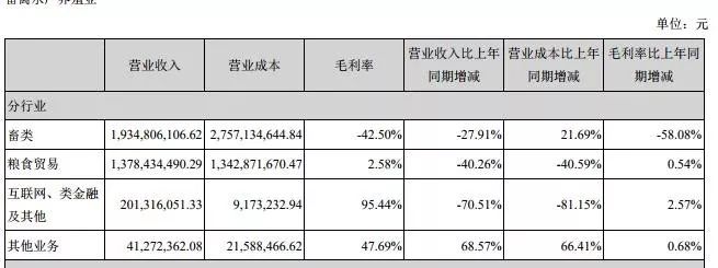*ST雏鹰近年来的财报显示,这家公司的主营业务中,畜类养殖占比只有50%左右,而粮食贸易占了40左右%,且这部分毛利率仅2%左右。而除此之外,真正赚钱的则是其互联网、类金融板块。