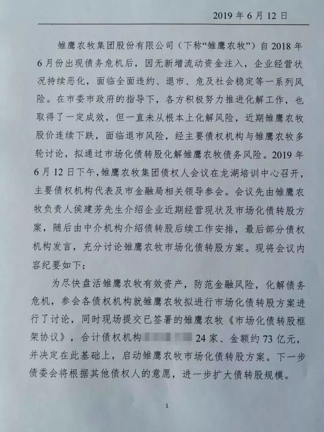 为解决迫在眉睫的债务危机,6月12日下午,*ST雏鹰债权人会议在郑州召开,参会方除公司管理层之外,还包括金融局相关领导和主要债权机构。会上,*ST雏鹰董事长侯建芳首先发言,对公司的经营情况做了相关介绍后,公布了拟定的债转股方案。随后中介机构介绍了债转股的后续安排,最后债权人对此进行了讨论。