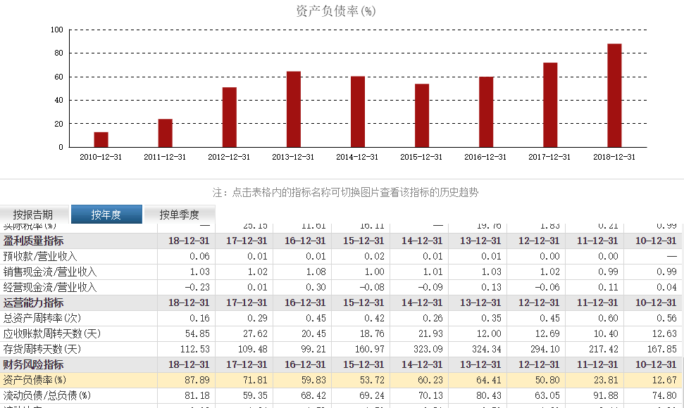 “冰冻三尺非一日之寒”,*ST雏鹰经营的恶化,小债从其负债率上发现了一些先兆。从2012年开始,公司负债率便由前一年的23.81%飙升至50.80%,之后一直维持在此之上。2016年后,*ST雏鹰负债率逐年升高,从近60%一路飙升至今90%。