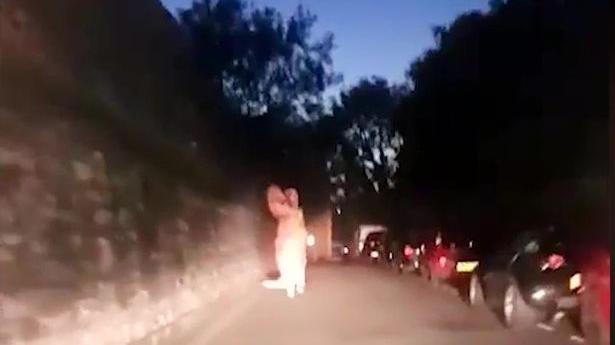 行车记录仪拍摄的视频显示,这个穿着霸王龙玩偶服的人,正在街道上狂奔,似乎是刚刚参加了类似化装舞会的活动。