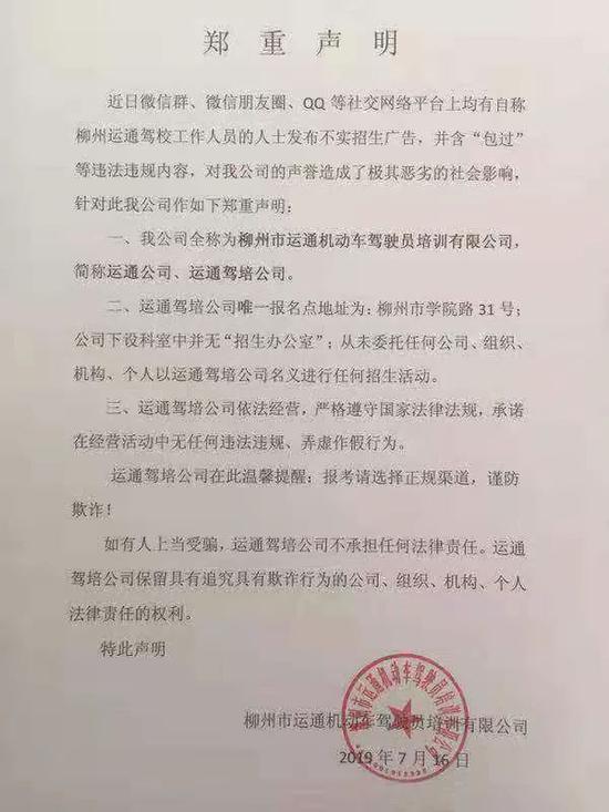 根据爆料网友提供的另一张盖有公章且署名为柳州市运通机动车驾驶员培训的公司发出声明表示:并无“招生办公室”,从未委托任何机构、个人进行任何招生活动。