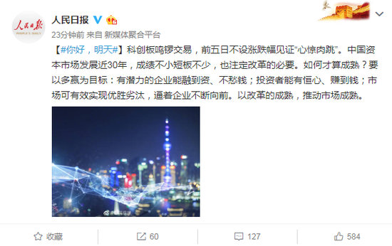 科创板鸣锣交易,前五日不设涨跌幅见证“心惊肉跳”。中国资本市场发展近30年,成绩不小短板不少,也注定改革的必要。如何才算成熟?要以多赢为目标:有潜力的企业能融到资、不愁钱;投资者能有恒心、赚到钱;市场可有效实现优胜劣汰,逼着企业不断向前。以改革的成熟,推动市场成熟。