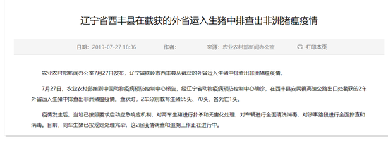 7月27日,农业农村部接到中国动物疫病预防控制中心报告,经辽宁省动物疫病预防控制中心确诊,在西丰县安民镇高速公路出口处截获的2车外省运入生猪中排查出非洲猪瘟疫情。查获时,2车分别载有生猪65头、70头,各死亡1头。