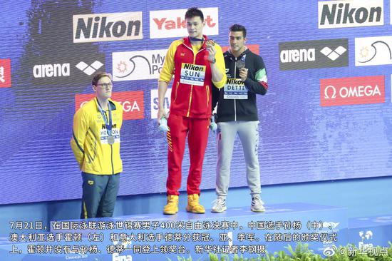 7月21日,在孙杨夺得世锦赛男子400米自由泳四连冠后,获得第二名的澳大利亚选手霍顿在颁奖典礼上自始至终没有登上领奖台领奖。