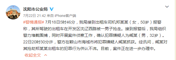 辽宁省沈阳市公安局官方微博7月22日晚发布警情通报称,7月18日5时46分,出租车司机郑某某(女,50岁)报警称,其所驾驶的出租车在开发区沈辽西路被一男子抢走。