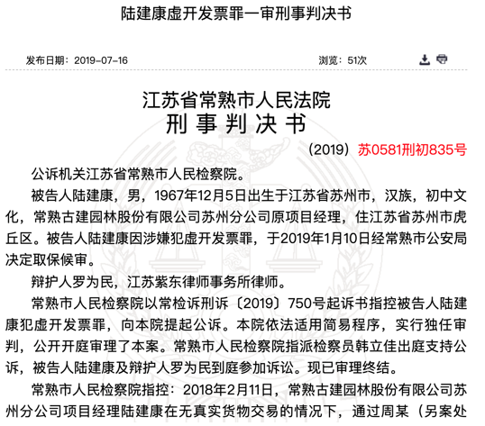 新浪财经讯 近日,裁判文书网公布了一则虚开发票罪判决书,新三板挂牌公司常熟古建分公司项目经理陆某某以支付开票费方式虚开15份共计价税121.55万元的增值税发票,用于冲抵常熟古建成本。陆某某因犯虚开发票罪被检察院提起公诉,法院依法判处其有期徒刑8个月,缓刑1年,并处罚金1万元。