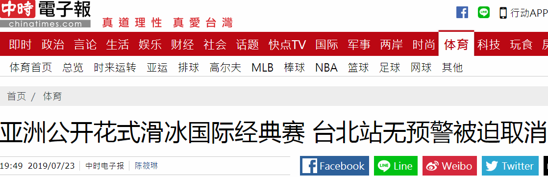 综合台湾“中央社”“中时电子报”等媒体7月23日报道,2019年亚洲公开花式滑冰国际经典赛-台北站原定今年10月30日到11月3日在台北举办,但台滑冰协会23日公告称,国际滑冰总会(ISU)22日晚上9时临时通知,认为台湾目前不适合举办国际赛事,取消台北的主办权。