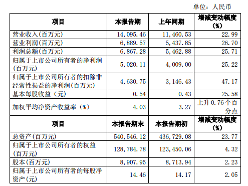 国泰君安上半年实现营收140.95亿元,同比增长22.99%;净利为50.2亿元,同比增长25%。基本每股收益0.54元。