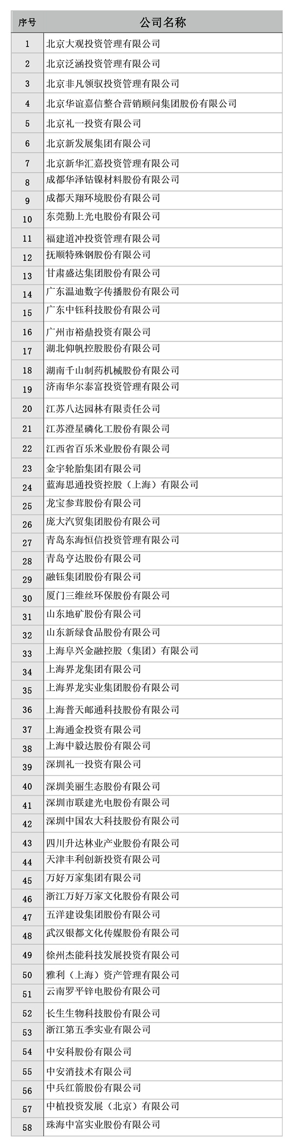 其中,长生生物、华泽钴镍、天翔环境、抚顺特钢、阜兴集团、万家文化、五洋建设等公司均在列。