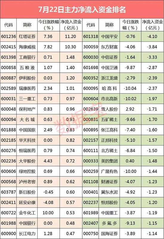 个股来看,共有6只个股主力资金净流入超亿元,红塔证券主力资金净流入11.20亿元,净流入资金居首;海康威视、工商银行紧随其后,全天净流入资金分别为10.3亿元、1.48亿元;全天净流入资金较多的还有五粮液、伊利股份等。股价表现方面,净流入资金超亿元个股今日平均上涨3.22%,表现强于大盘。
