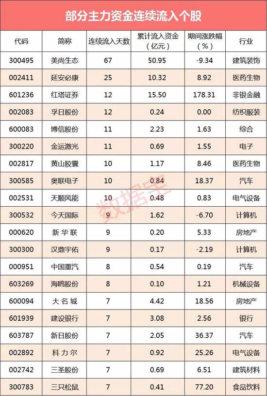 证券时报?数据宝统计显示,截至7月22日收盘,共有42只个股主力资金连续5个交易日以上持续净流入,连续流入天数最多的是美尚生态,该股已连续67个交易日净流入;连续净流入天数较多的还有延安必康、孚日股份等,主力资金分别连续流入25天、12天。