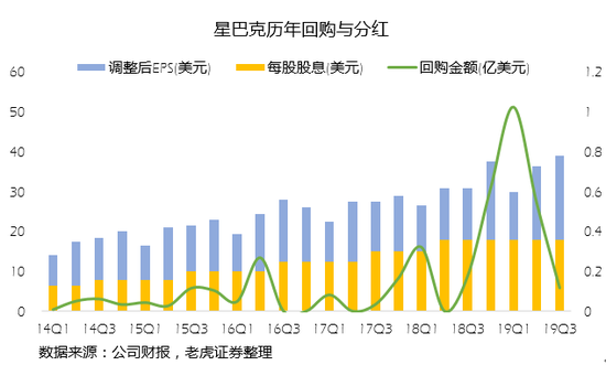 公司本身良好的财务状况也是给提高股息和增加回购良好的环境。2019年上半年星巴克进行了较大的回购,流通股已从去年的14.1亿股下降到12.4亿股,也因此,每股收益获得了不错的提升。