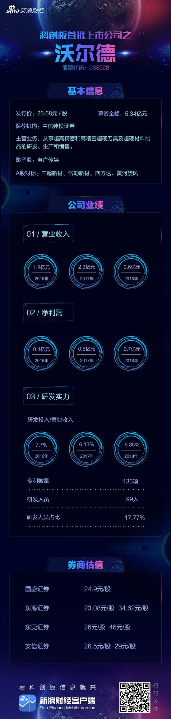 新浪财经讯 7月22日消息,万众瞩目的科创板将在今天开板,首批25家公司齐亮相。开板首日,沃尔德首日开盘涨102%,报53.89。