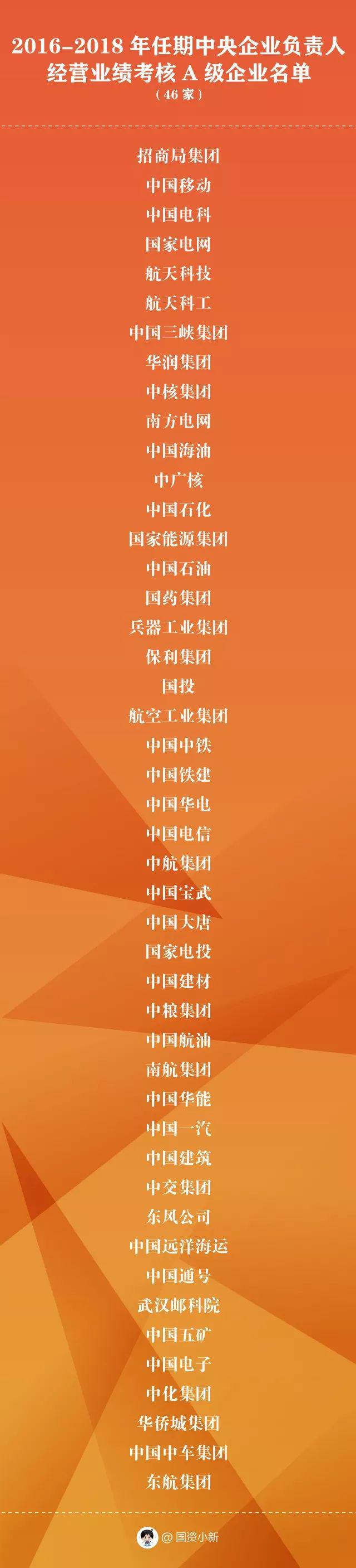 2016-2018年任期考核结果为A级的企业46家——