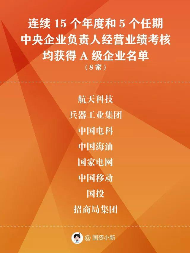 国资委对中央企业实施经营业绩考核以来,有8家企业连续15个年度和5个任期均获得A级——