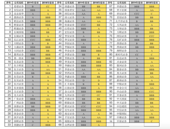 新浪财经讯 7月26日消息,备受期待的2019年分类评价结果今天披露,跟去年相比,AA券商数量从12家下滑到10家,广发证券、申万宏源、东方证券、银河证券均掉出“AA梯队”,其中广发证券甚至从AA直接成为BBB,而天风证券、国信证券今年则成为新晋的“AA券商”。