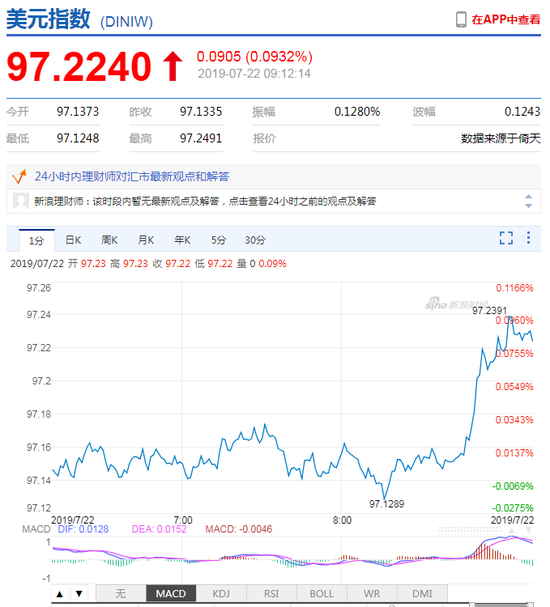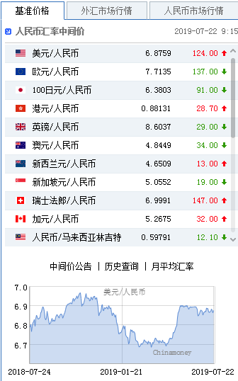 新浪财经讯 7月22日,美元指数小幅拉升,人民币中间价报6.8759,下调124点,上一交易日中间价报6.8635 ,在岸人民币上一交易日收报6.8765。