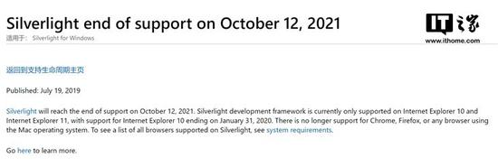 IT之家7月22日消息 微软官方网站宣布,Silverlight将在2021年10月12日停止支持,适用于Silverlight for Windows。
