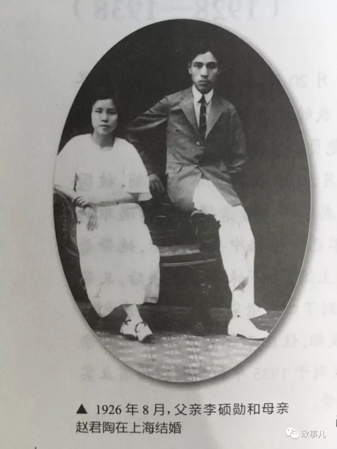 我出生在一个革命家庭。我的父亲叫李硕勋,母亲叫赵君陶(原名赵世萱),他们于1926年8月在上海大学结成良缘,成为一对志同道合、相亲相爱的革命伴侣。从他们的结婚照片上可以看出,母亲坐在一个大椅子上,相貌端庄、温柔文雅,父亲坐在母亲身旁,身材修长,刚强坚毅。这张照片我母亲一直珍藏在身边,这是她幸福而永恒的纪念。