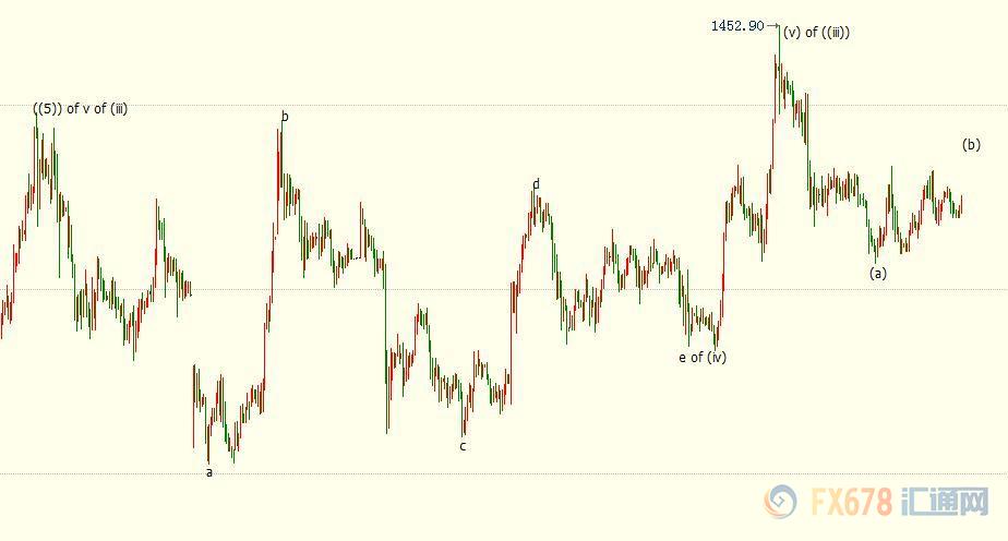 (b)浪是隶属于自1453美元开启的下行((iv))浪走势。短期来看,金价料回落到1382美元,即始于1266美元的((iii))浪61.8%目标位。((iv))浪回调极限目标看至1347美元,即((ii))浪的期待你。