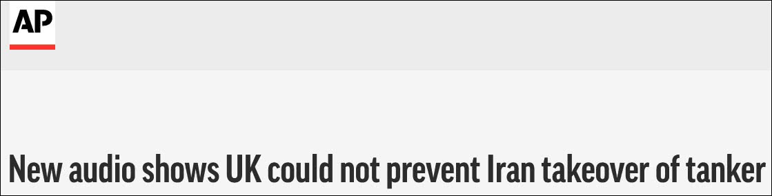 视频公开后,“今日俄罗斯”(RT新闻)20日报道称,伊朗伊斯兰革命卫队表示,英国军舰曾尝试干预,但失败了。音频曝光后,美联社22日直指,曾经强大的英国皇家海军无法阻止这艘船被扣押。