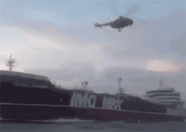 伊朗伊斯兰革命卫队20日公布的一段视频显示,伊斯兰革命卫队快艇包围了当时明显在全速前进的“史丹纳帝国”号油轮,期间,伊朗海军得到一架军用直升机的支援,这架直升机引导一支突击队降落在油轮甲板上。