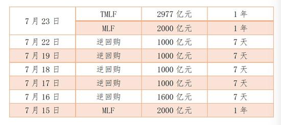 7月23日,人民银行开展定向中期借贷便利(TMLF)操作2977亿元以及中期借贷便利(MLF)操作2000亿元,与当天到期量5020亿元相比,略有缩量。