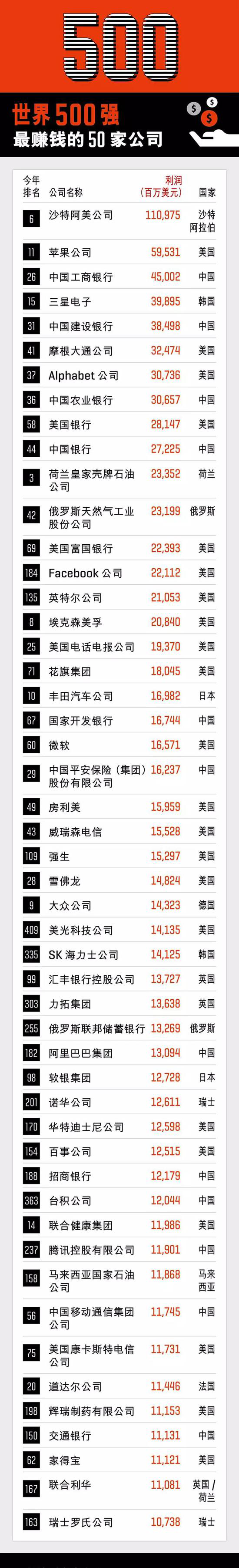 在盈利方面,沙特阿美以近1110亿美元的超高利润登顶利润榜首位,苹果位列第二。利润榜前10位的四家中国公司仍然是工建农中四大银行,谷歌母公司Alphabet则以年度142.7%的利润增长率成功跻身前十强,位列第七。