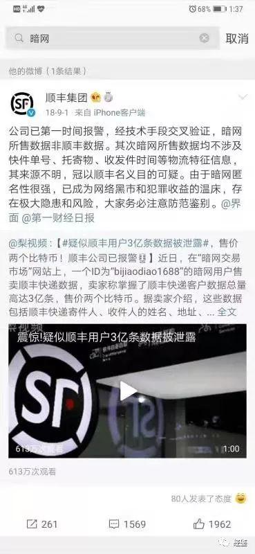 2018年7月,中国企业报股份有限公司旗下微信公众号《经鉴》报道组在某媒体线索群发现,有人反映一个ID为“bijiaodiao1688”的暗网用户在“暗网”售卖顺丰快递数据,其称掌握了顺丰快递客户数据总量高达3亿条,售价两个比特币。《经鉴》报道组调查核实该情况后,于2018年8月31日在微信公众号《经鉴》上发表了《3亿条疑似顺丰用户数据泄漏 暗网交易售价两个比特币》一文。
