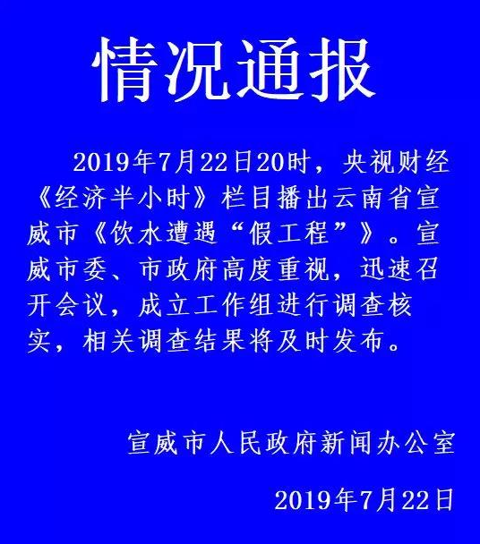 中国网7月23日讯 据云南省宣威市市委宣传部官方微信公众号消息,22日,宣威市人民政府新闻办公室就云南宣威“饮水遭遇'假工程'”一事发出情况通报。通报中称,宣威市已成立工作组进行调查核实。