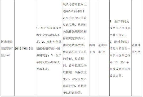 此外,记者还发现,2019年6月5日,“怀来赤霞”曾因存在安全生产隐患,在怀来县应急管理局上半年双随机执法中被责令整改。据怀来县人民政府官网显示,“怀来赤霞”存在的问题主要有生产车间及成品库安全警示标志不足、配料车间北墙配电箱存在一闸多用现象、生产车间及成品库房灭火器不足等,复查结果显示相关问题已整改完毕。