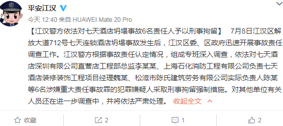 7月8日,武汉市江汉区解放大道712号一七天连锁酒店坍塌,事故未造成人员伤亡。武汉市江汉区公安分局官方微博7月26日发文表示,7月8日江汉区解放大道712号七天连锁酒店坍塌事故发生后,江汉区委、区政府迅速开展事故责任调查工作。江汉警方根据事故责任认定情况,组成专班深入调查,依法对七天酒店深圳有限公司直营店工程部总监李某某、上海石化消防工程有限公司负责七天酒店装修装饰工程项目经理魏某、松滋市陈氏建筑劳务有限公司实际负责人陈某等6名涉嫌重大责任事故罪的犯罪嫌疑人采取刑事拘留强制措施。对其他单位有关人员还在进一步调查中,并将依法严肃处理。